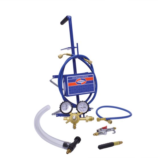 A versatile, all-in-one kit that includes a Nitrogen regulator with a delivery pressure up to 400 PSI for pressure testing an A/C&R system for leaks. It also includes many accessories for cleaning condensate drain lines and for blowing off coils. It even has a air chuck to fill up that flat tire. As a bonus, our Sludge Blaster® is included. Carry stands are sold seperately.
